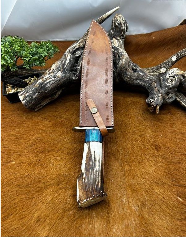 Tres jolie bowie lame en acier damas VG10 256 couches tres auguisée de 27,5 cm De chez Rite Edge Cutlery USA Longueur bowie totales 43 cm Manche en bois de cerf (voir photos magnifique travail artisanal) PIECE UNIQUE Etui cuir de vache
