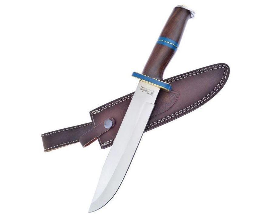 14" (35,56 cm) hors tout. Lame en acier inoxydable satiné de 8,25" (20,96 cm). Manche en palissandre. Pommeau en inox. Incrustation de garde et de poignée turquoise Kingsman. Fourreau de ceinture en cuir marron. En boîte.